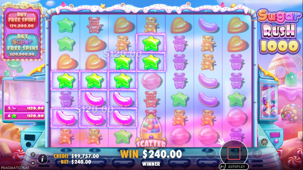I modsætning til traditionelle spilleautomater, der bruger betalingslinjer, er Sugar Rush 1000 baseret på et cluster pays-system. Gevinster opnås ved at lande grupper af matchende symboler, der forbinder enten vandret eller lodret. Jo større klyngen er, desto højere bliver udbetalingen.